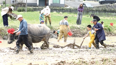 大家一个接一个上前,在农民伯伯手把手指导下,扶着犁柄,跟着水牛的脚步往前走,泥浆溅得满身都是,不小心摔倒了,也没有喊脏的,反而都笑得前仰后合。